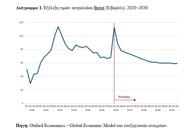 Η αναθεώρηση του βασικού σεναρίου στηρίζεται στη λογική του αρχικού Σεναρίου Α που είχαμε δείξει στην παραπάνω ανάλυση, δηλαδή ενός βραχυχρόνιου σοκ, αλλά με σημαντική προσαρμογή της διαδρομής των τιμών του πετρελαίου σύμφωνα με τις πρόσφατες εκτιμήσεις της Oxford Economics (Oxford Economics – World Economic Prospects, 13 April 2026).