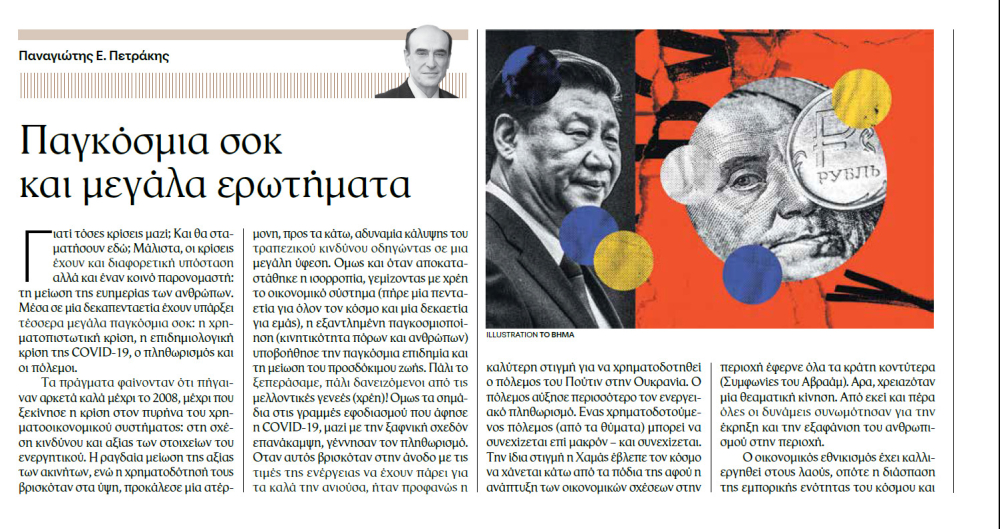 Γιατί τόσες κρίσεις μαζί; Και θα σταματήσουν εδώ; Μάλιστα, οι κρίσεις έχουν και διαφορετική υπόσταση αλλά και έναν κοινό παρονομαστή: τη μείωση της ευημερίας των ανθρώπων. Μέσα σε μία δεκαπενταετία έχουν υπάρξει τέσσερα μεγάλα παγκόσμια σοκ: η χρηματοπιστωτική κρίση, η επιδημιολογική κρίση της COVID-19, ο πληθωρισμός και οι πόλεμοι.