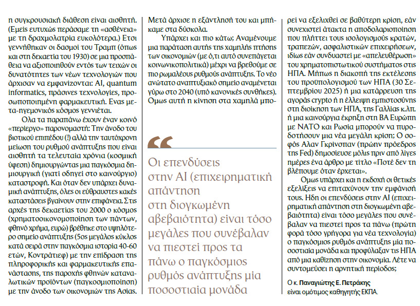 Υπάρχει και πιο κάτω; Αναμένουμε μια παράταση αυτής της χαμηλής πτήσης των οικονομιών (με ό,τι αυτό συνεπάγεται κοινωνικοπολιτικά) μέχρι να βρεθούμε σε πιο ρωμαλέους ρυθμούς ανάπτυξης. Το νέο ανώτατο αναπτυξιακό σημείο αναμένεται γύρω στο 2040 (υπό κανονικές συνθήκες). Όμως αυτή η κίνηση στα χαμηλά μπορεί να εξελιχθεί σε βαθύτερη κρίση, εάν συνεχιστεί άτακτα η αποδολαριοποίηση που πλήττει τους ισολογισμούς κρατών, τραπεζών, ασφαλιστικών επιχειρήσεων, ιδίως εάν συνδυαστεί με «απελευθέρωση» του χρηματοπιστωτικού συστήματος στις ΗΠΑ. Μήπως η διακοπή της εκτέλεσης του προϋπολογισμού των ΗΠΑ (30 Σεπτεμβρίου 2025) ή μια κατάρρευση της αγοράς crypto ή η έλλειψη εμπιστοσύνης στη διοίκηση των ΗΠΑ, της Γαλλίας κ.λπ. ή μια καινούργια έκρηξη στη ΒΑ Ευρώπη με NATO και Ρωσία μπορούν να πυροδοτήσουν μια νέα μεγάλη κρίση; Ο σοφός Άλαν Γκρίνσπαν (πρώην πρόεδρος της Fed) δημοσίευσε μόλις πριν από λίγες ημέρες ένα άρθρο με τίτλο «Ποτέ δεν τη βλέπουμε όταν έρχεται».