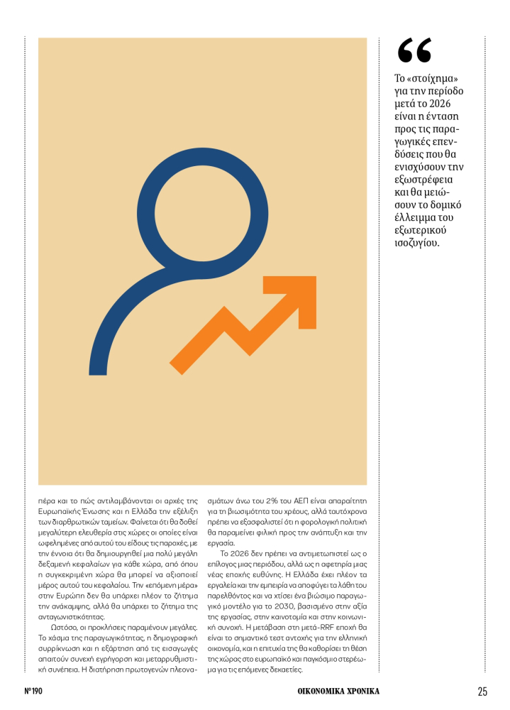 Το «στοίχημα» για την περίοδο μετά το 2026 είναι η ένταση προς τις παραγωγικές επενδύσεις που θα ενισχύσουν την εξωστρέφεια και θα μειώσουν το δομικό έλλειμμα του εξωτερικού ισοζυγίου. Η αναμόρφωση του κληρονομικού δικαίου και η επιτάχυνση της απονομής δικαιοσύνης αποτελούν κρίσιμους παράγοντες για τη βελτίωση του επενδυτικού κλίματος.